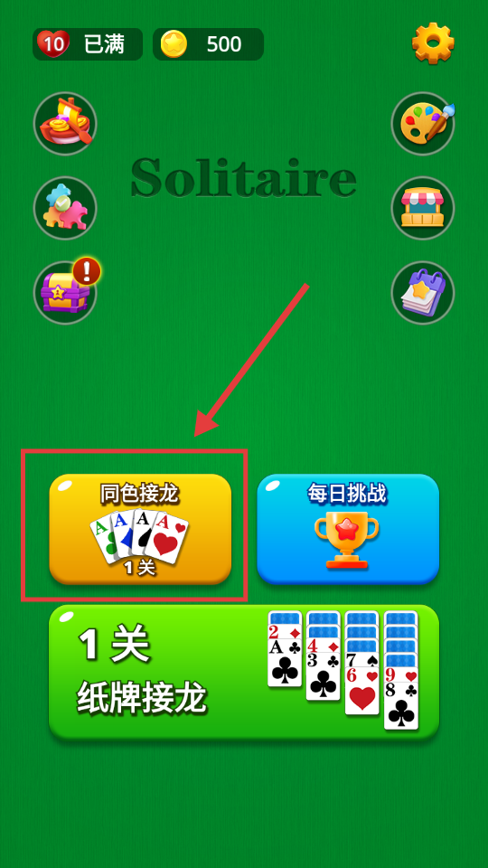 1、主界面点击【同色接龙-1关】按钮,进入纸牌接龙第一关,开始游戏。
