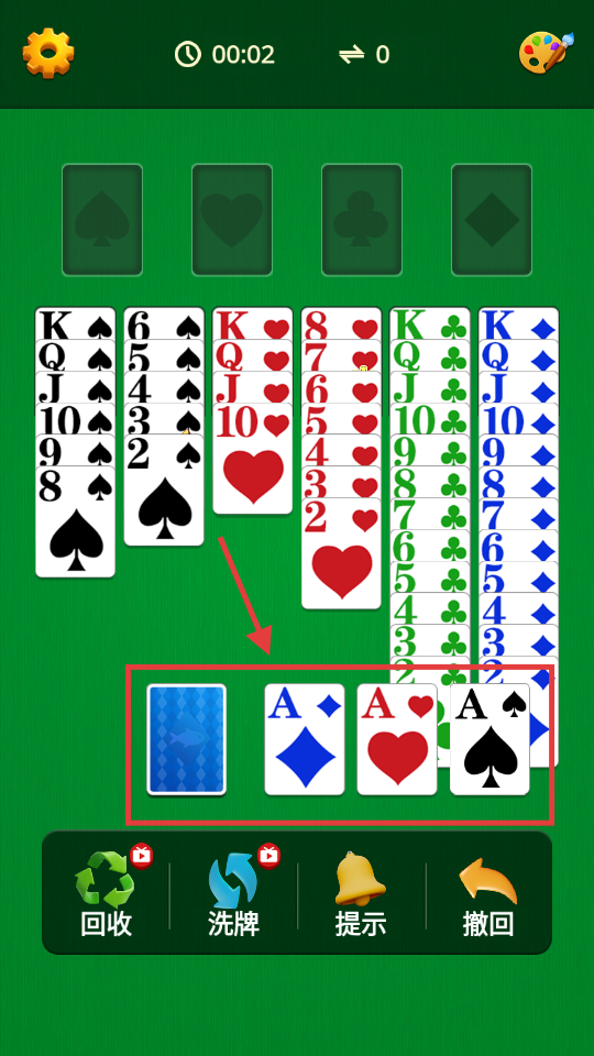 2、游戏内点击底部发牌区含【A-♦】【A-♥】【A-♠】的牌堆,触发发牌操作。