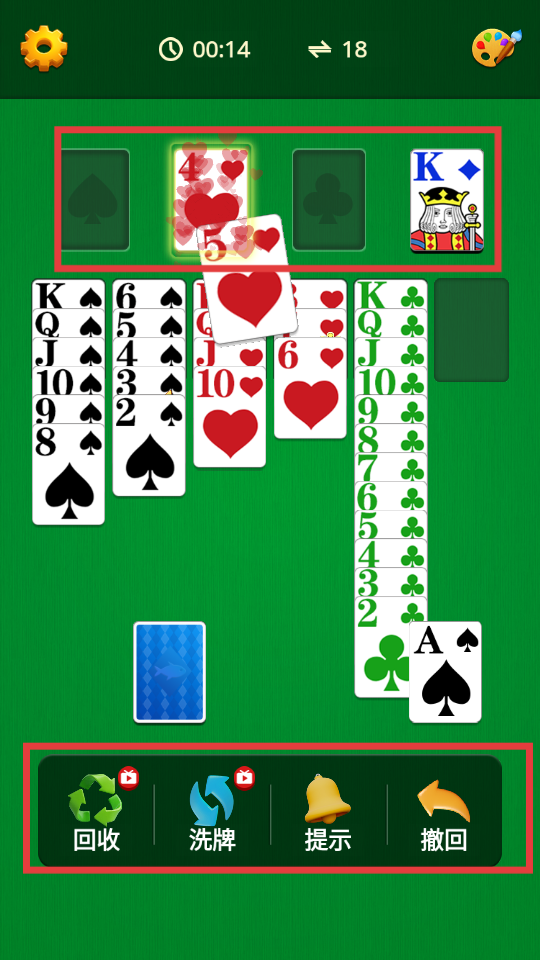 3、卡关时使用底部【回收】【洗牌】【提示】功能,调整牌局继续接龙。