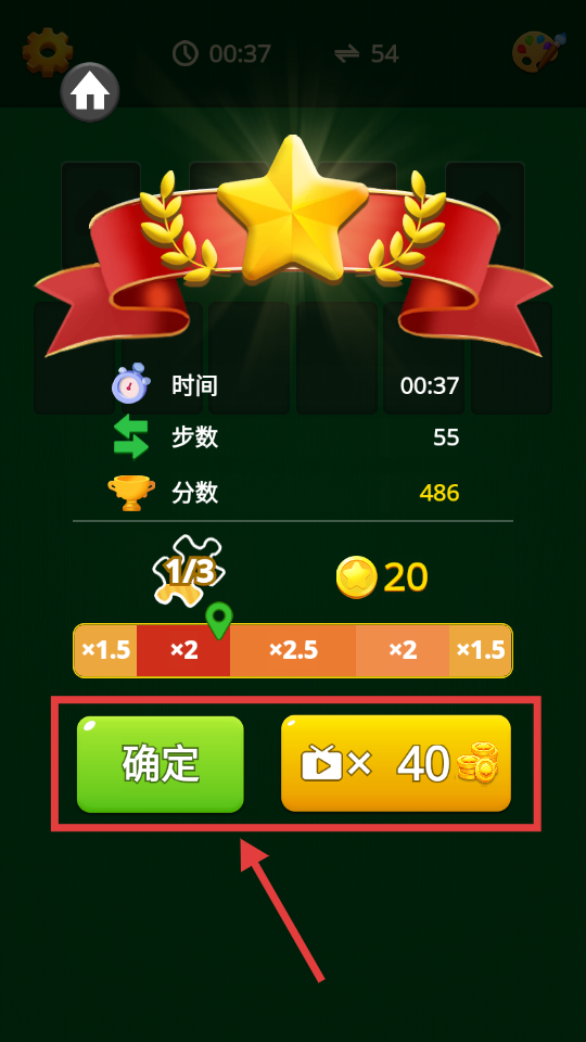4、通关后点击【确定】领基础奖励,或看广告得【40-金币】额外奖励。