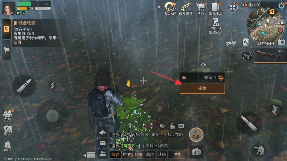 1、找到“麻”资源,点击【采集】,获取制作绷带的材料。