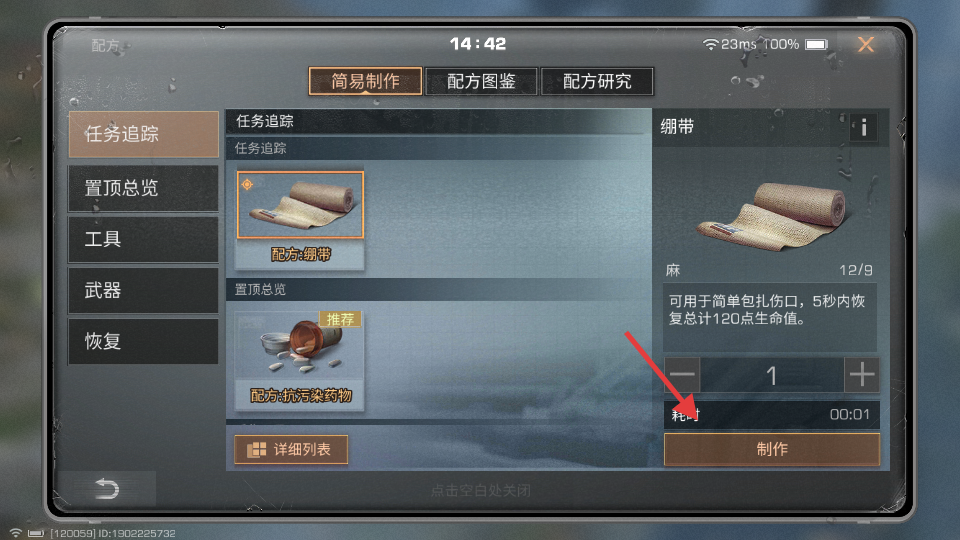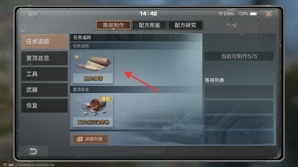 3、在配方界面的任务追踪中,选择【配方:绷带】。