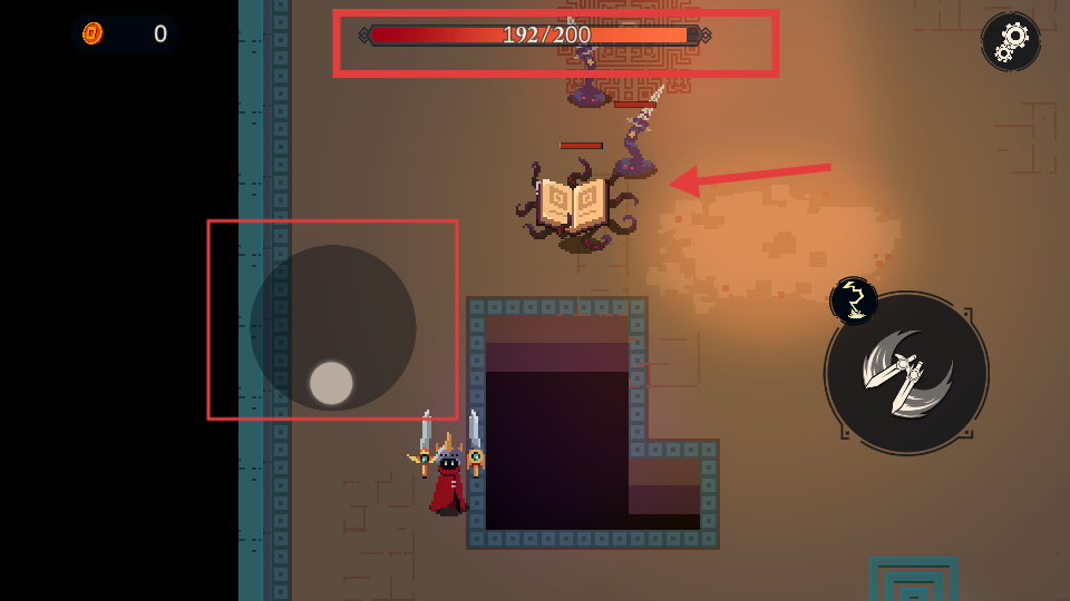 2、关注上方【192/200】生命值,用左侧移动轮盘控制角色,靠近书型敌人准备攻击。