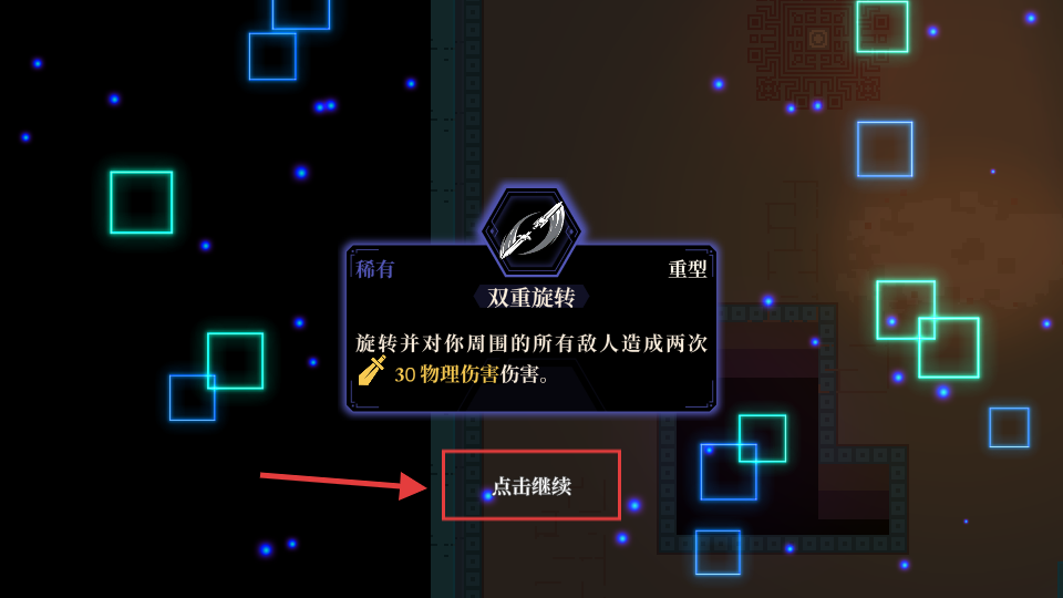 4、获得【双重旋转】技能,可造成两次【30】物理伤害,点击【点击继续】继续游戏。