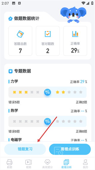 2、进入“易错分析”页面,点击下方【错题复习】。