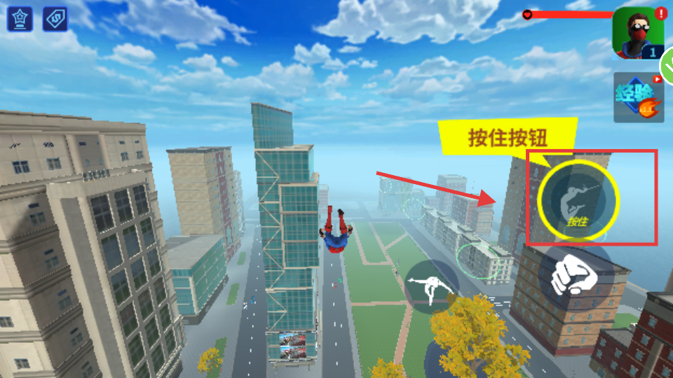 1、在空中时按住【按住按钮】,通过【操控】键调整姿势,保持稳定下落避免碰撞建筑。
