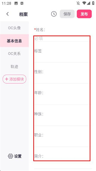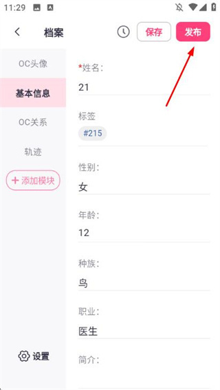 3、填写基本信息,包括姓名、标签、性别、年龄、种族、职业、简介等。