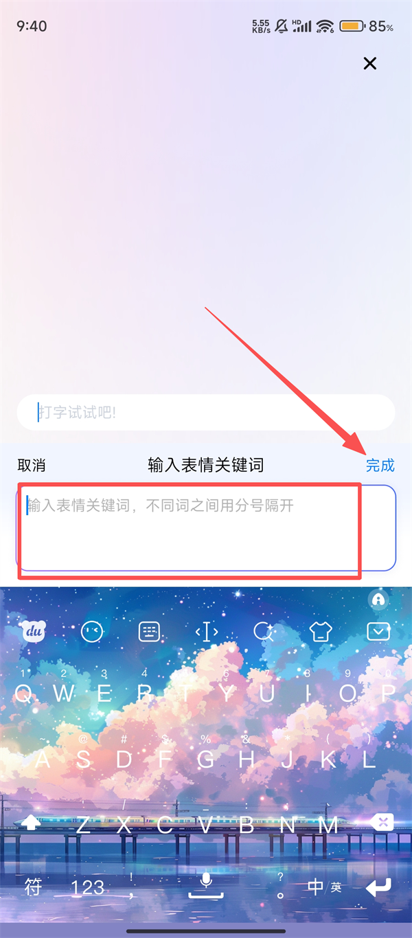 4、在输入框中填入表情关键词,不同词用分号隔开,再点击【完成】,专属AI表情就制作好啦。