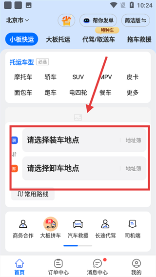 1、在首页,选择装车地点和卸车地点,进入装车地址确认页面。