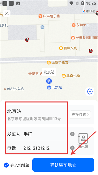 2、填写发车人、电话等信息,点击【确认装车地址】。