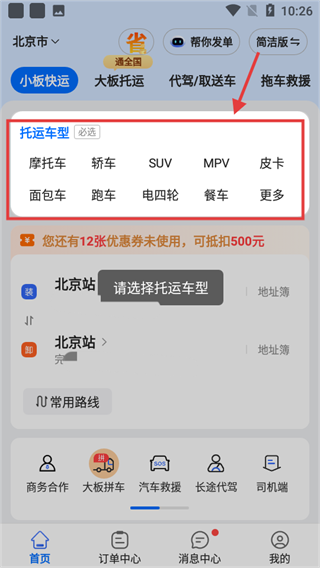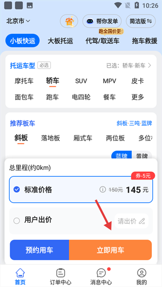 4、选择板车类型,设置价格方式,点击【立即用车】,完成操作。