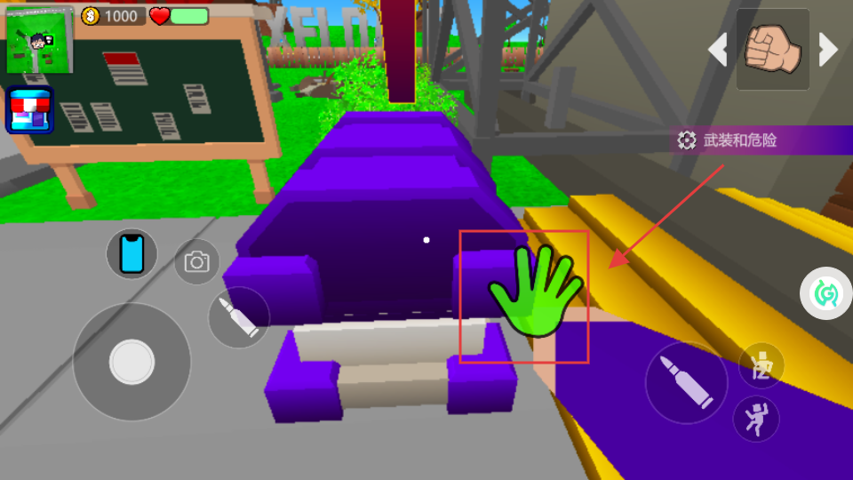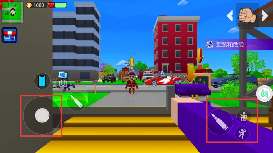 2、游戏内界面显示【武装和危险】任务,左侧有移动轮盘,右侧有道具-动作按钮,需用这些操作探索场景。