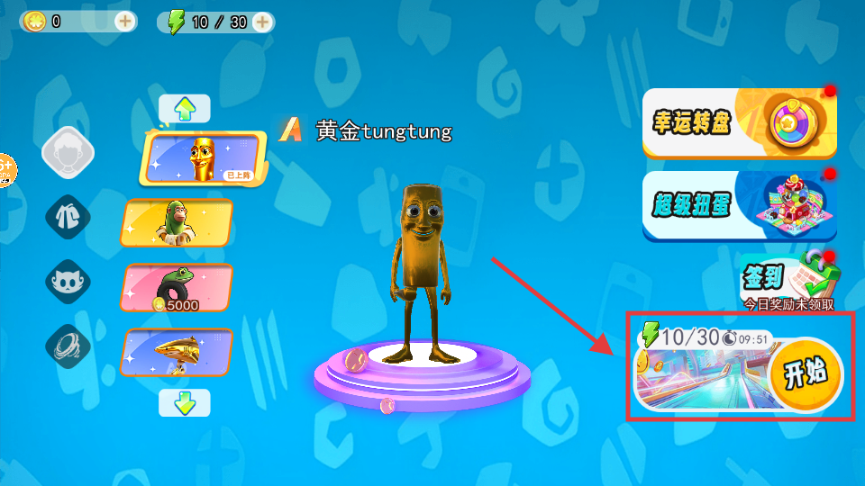 1、主界面中,点击【10/30】体力旁的【开始】按钮可进入关卡,界面还有【黄金tungtung】角色、【幸运转盘】【超级扭蛋】等功能。