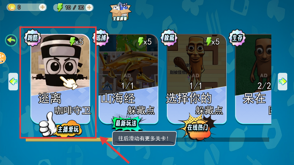 2、关卡选择界面,优先选【跑酷】-【逃离咖啡守卫】(主播爱玩)关卡,或往后滑动查看更多关卡如【追捕】-【山海经躲藏点】等。