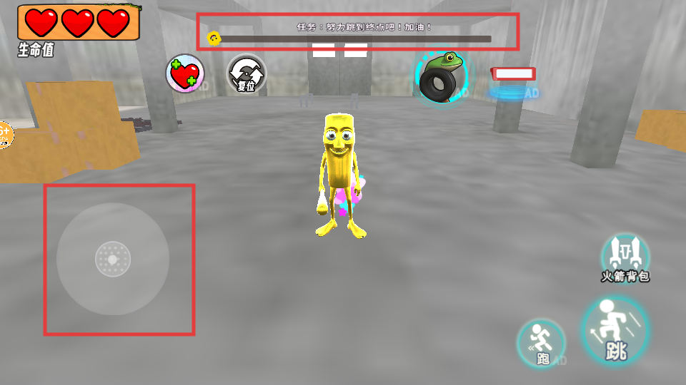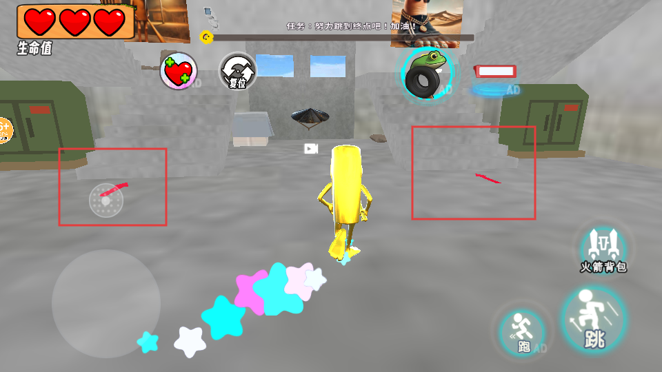 3、游戏内用左下角【方向轮盘】控制移动,配合右侧【跑】【跳】按钮前进,注意【生命值】-【三颗心】,完成【努力跑到终点吧!加油!】任务。
