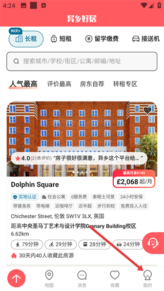 异乡好居app官网版专业的手机在线租房工具,软件可以很好的帮助异国的工作者、留学生等群体,提供最好的优质租房、买房帮助,这里的各种房源信息是非常丰富的,你可以自由通过软件获得最好的各种房源信息,而且软件中还有海量的全新资源可以选择,异乡好居app官网版软件还可以自由对各种房源信息进行自由筛查,一键对各个房源进行快速预订,这里还有更多的租房优惠为你提供,对各种海外租房感兴趣的用户不要错过,软件中还有非常多的全新功能为你提供,满足你的手机在线使用需要。