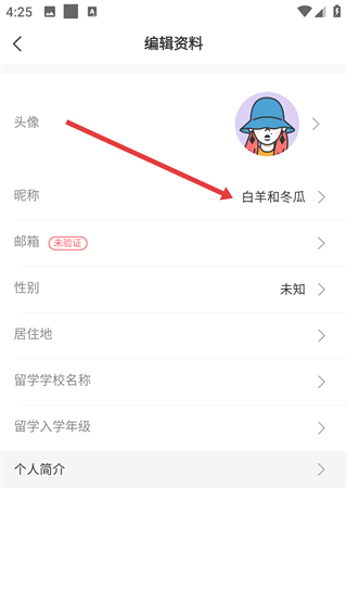 3、在【编辑资料】中,点击【昵称】,进入昵称修改界面,即将自定义专属昵称哟。