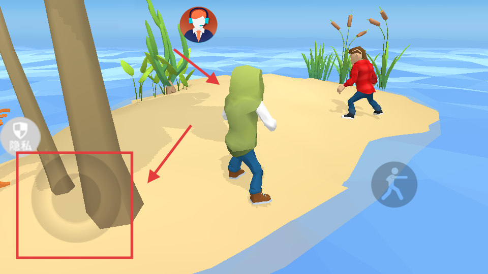 2、控制左侧【移动-轮盘】移动角色,朝着红衣服敌人的方向前进,靠近目标以便发起攻击。