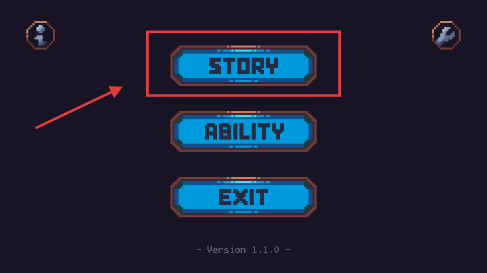 1、主菜单界面选【STORY】进入剧情模式,忽略【ABILITY】和【EXIT】选项,开始游戏流程。