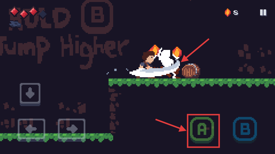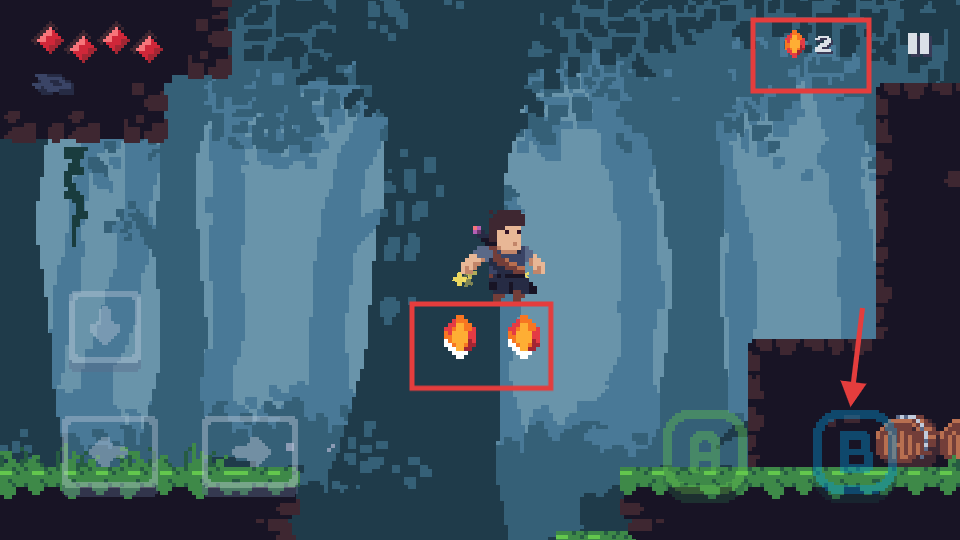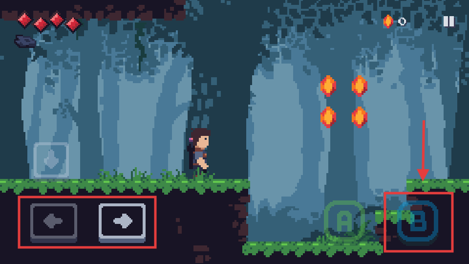 2、用左下角【左右-箭头】控制角色移动到右侧,用【B-互动键】准备触发跳跃。
