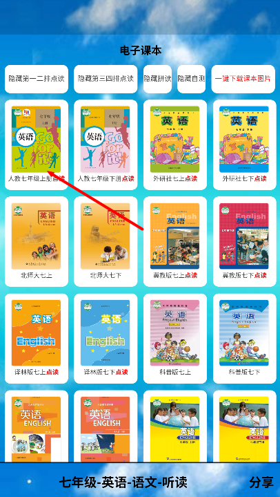 1、进入软件后,在教材选择界面中找到并点击“七年级上册点读”,进入对应教材的学习页面,准备开始课文学习。