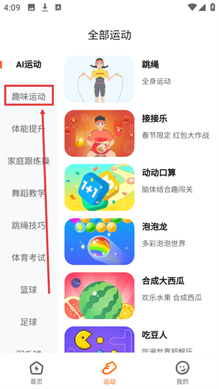 2、进入全部运动页面后,点击左侧【趣味运动】分类,即可筛选出趣味类运动项目列表。