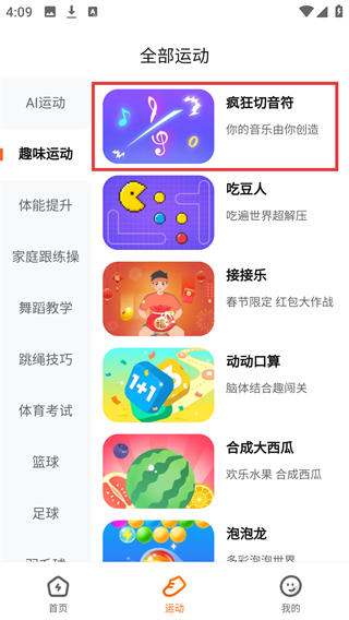 3、在趣味运动列表中,找到【疯狂切音符】项目,点击该项目卡片进入对应的运动详情页。