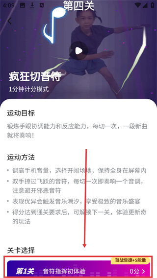 4、在疯狂切音符详情页,可查看运动目标与方法,点击【第1关-音符指挥初体验】即可开始该关卡运动。