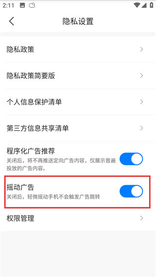 4、在隐私设置页面,找到【摇动广告】对应的开关按钮,点击将其关闭。