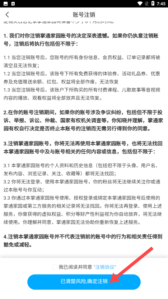 4、在账号注销页面,阅读注销协议后,点击【已清楚风险,确定注销】按钮,进行账号注销操作。