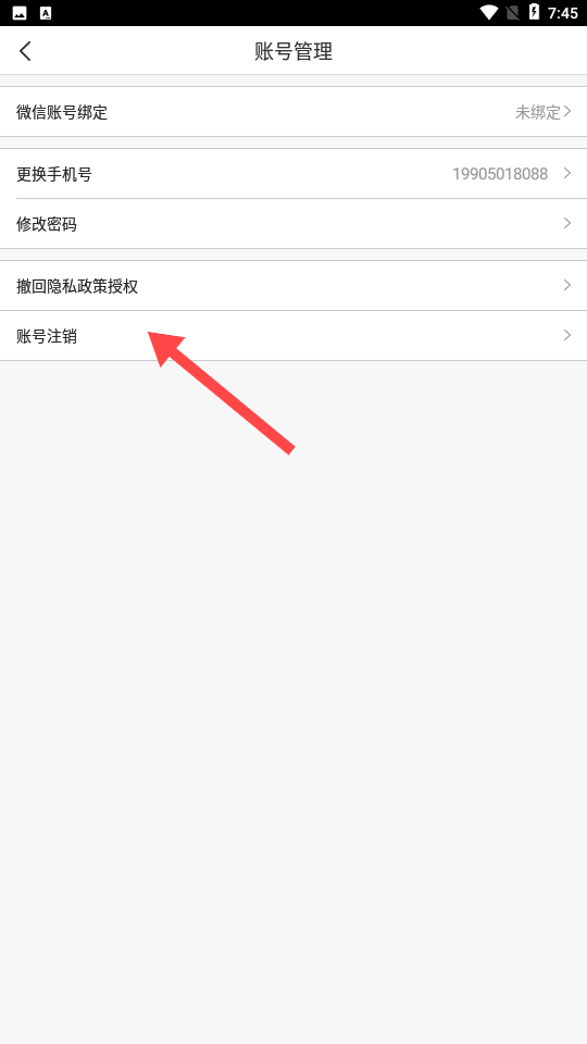 3、在账号管理页面,点击【账号注销】选项,进入账号注销相关页面。