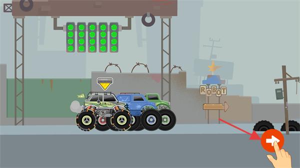1、点击右侧橙色箭头按钮启动大脚车,操控车辆向前行驶,同时留意上方绿色信号灯区域,推进关卡进程。