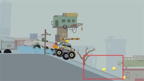 2、在坡道场景中操控大脚车行驶,收集右侧区域的金币道具,保持车辆稳定避免掉落,积累关卡资源。
