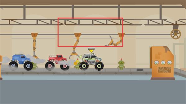 3、进入工厂场景后,操控大脚车避开上方机械臂障碍,同时与其他车辆保持距离,稳定推进关卡。