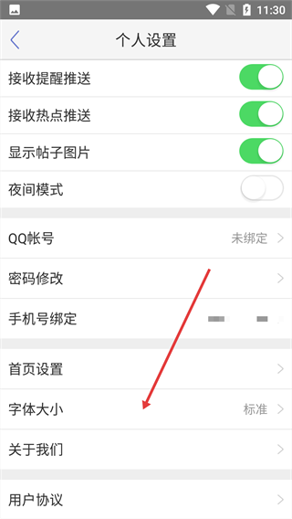 3、在【个人设置】页面中,找到并点击【字体大小】选项。