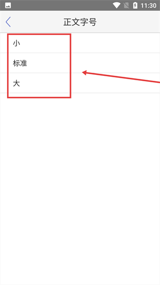 4、进入【正文字号】页面,可选择【小】【标准】【大】三个选项,完成字体大小的设置。