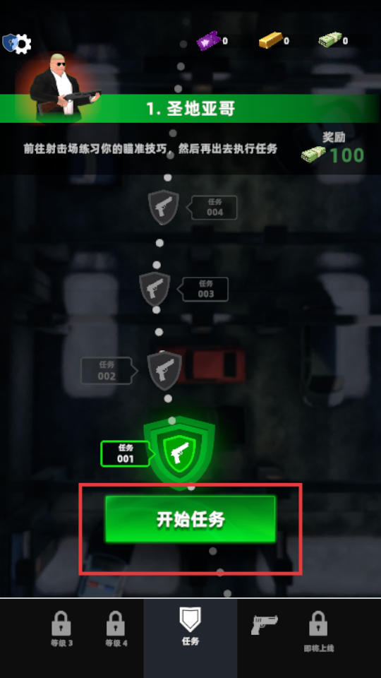 1、进入【圣地亚哥】任务界面后,选择【任务-001】对应的【开始任务】按钮,开启射击场练习任务。