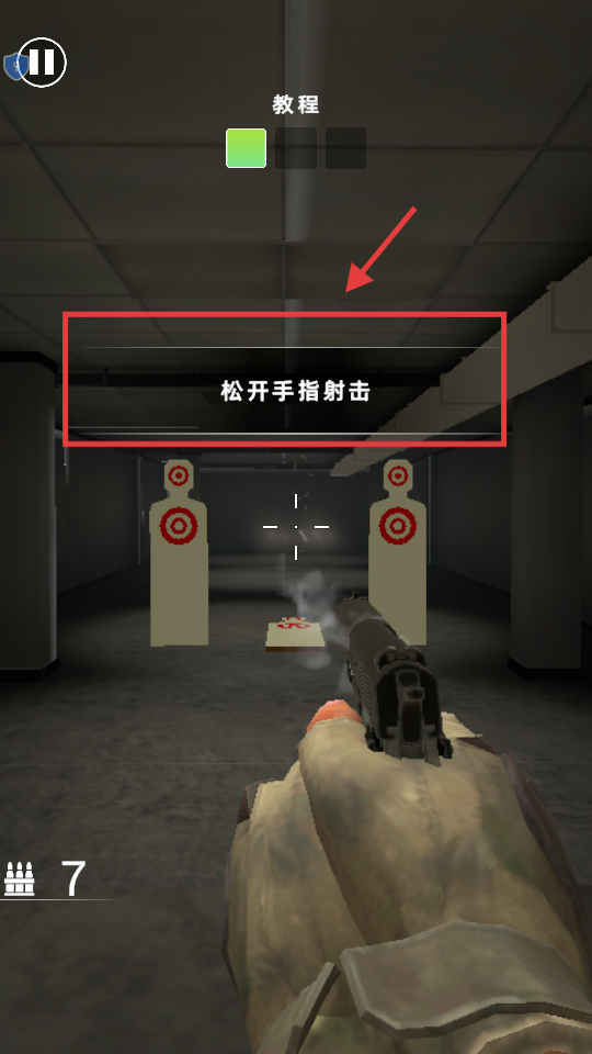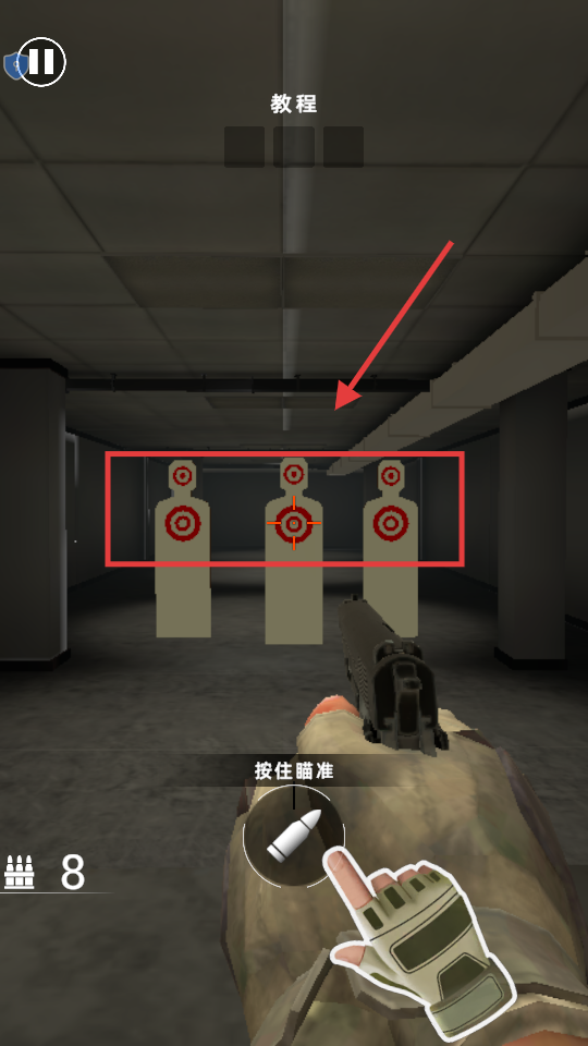 2、在【教程】场景中,对准前方的靶子区域,按住【按住瞄准】按钮,完成瞄准准备。
