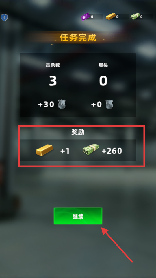 4、任务完成后,可获得【黄金-+1】和【美金-+260】的奖励,点击继续按钮进入下一个任务。