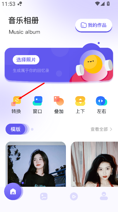 1、进入《个人相册》app首页后,点击“转换”功能入口,可开始进行照片视频化制作操作。