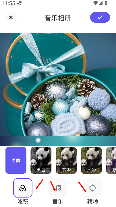 3、完成选择后,可为作品添加滤镜、音乐及转场效果,调整完成后即可生成成品,保存或分享使用。