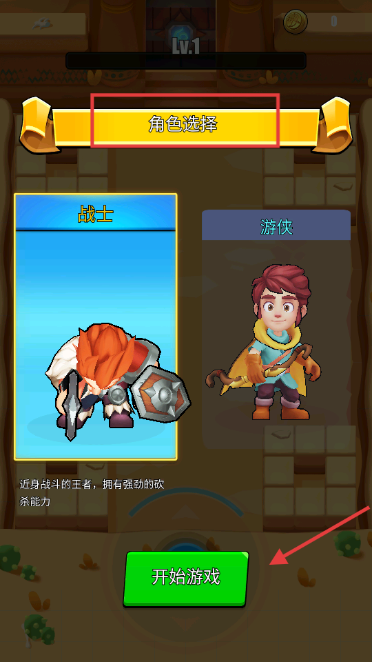 1、进入游戏后先进行【角色选择】,可选择【战士】或【游侠】,【战士】是近身战斗王者拥有强劲砍杀能力,选好角色后点击【开始游戏】进入战斗。