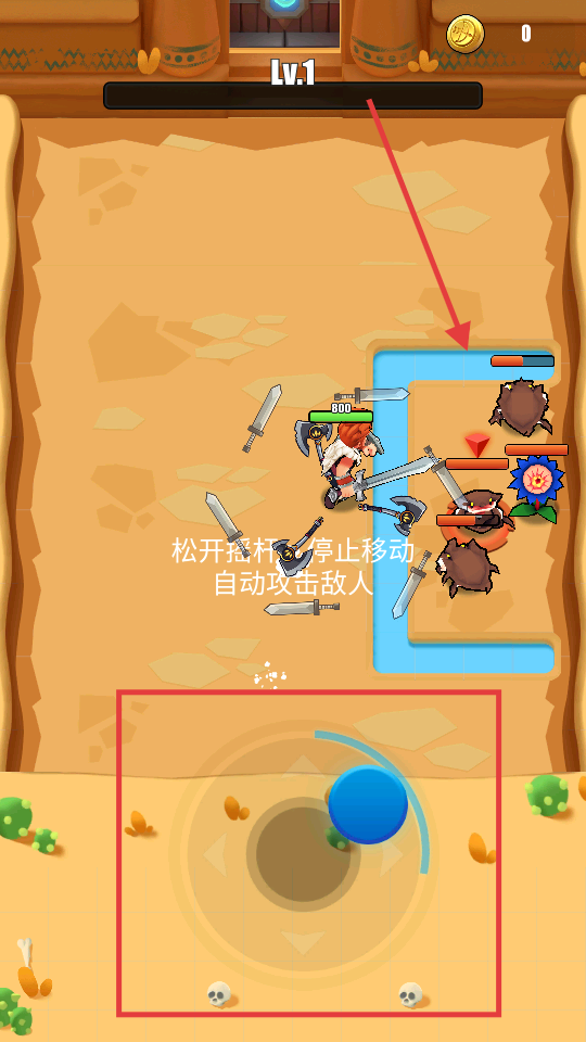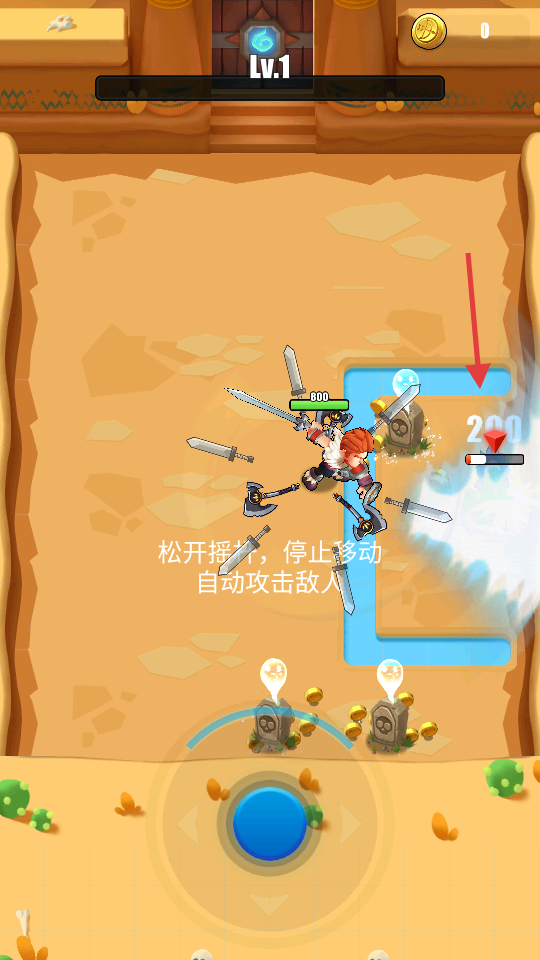 2、战斗中通过底部摇杆控制角色移动,松开摇杆会停止移动并自动攻击敌人,注意躲避敌人同时利用自动攻击输出,提升生存和击杀效率。