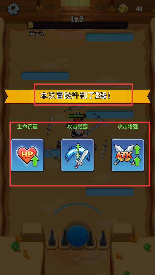 4、冒险升到【2级】时,会出现【生命祝福】【攻击范围】【攻击增强】三个增益选项,根据当前战斗需求选择其中一个,提升角色对应能力帮助后续闯关。