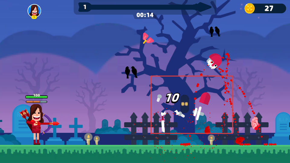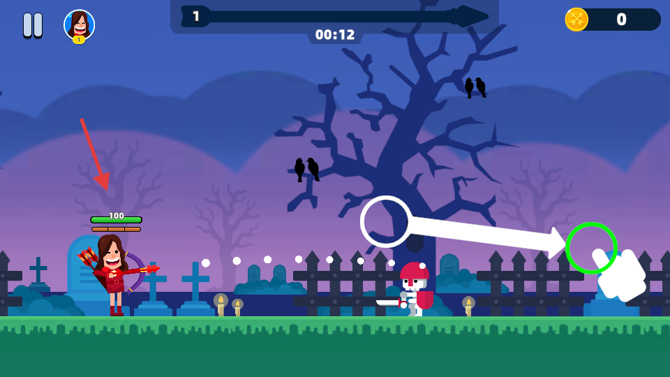 2、拖动瞄准器对准前方敌人,释放弓箭完成攻击,注意角色左侧的生命值【100】需保持安全。