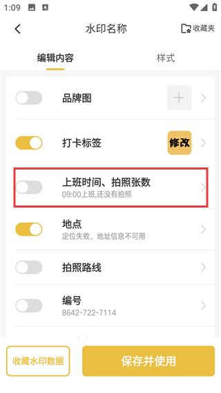 2、在水印名称页找到【上班时间、拍照张数】选项并开启,点击进入编辑。