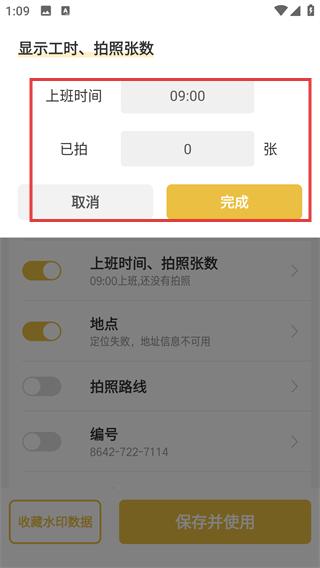 3、在“显示工时、拍照张数”弹窗中,设置上班时间(如09:00),点击【完成】确认。