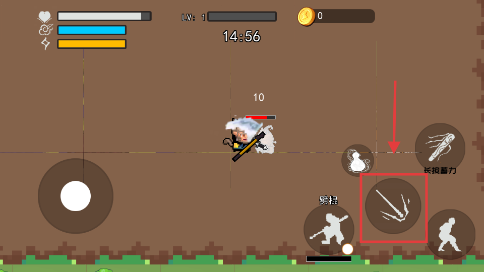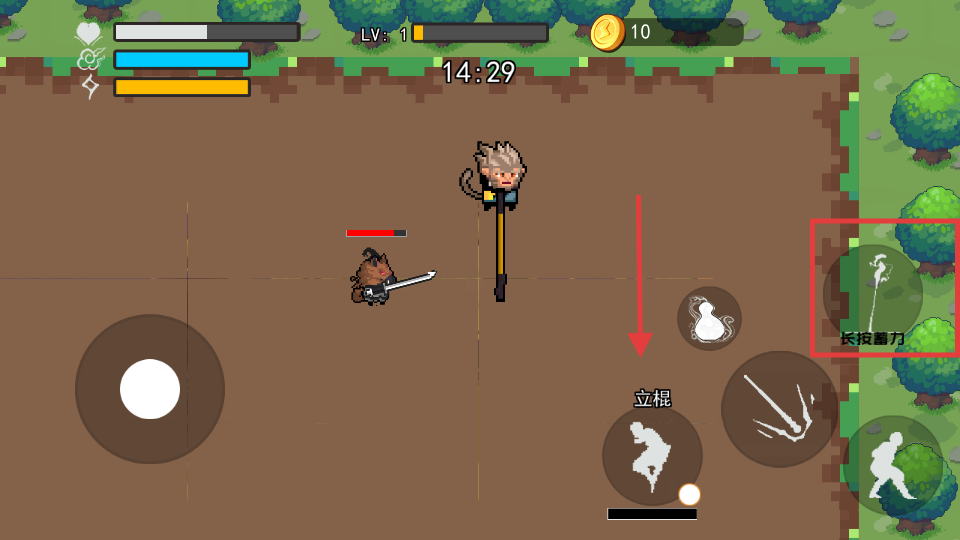 2、战斗界面右下角有【劈棍】等技能按钮,部分技能需要长按蓄力才能释放,蓄力时要注意躲避敌人的攻击。