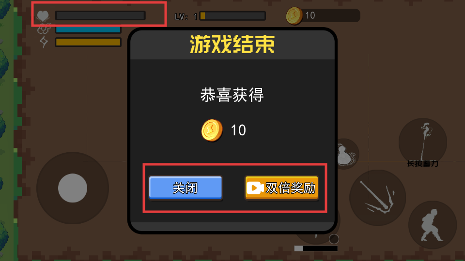 4、游戏结束后会显示获得【10】金币,可选择【关闭】界面或观看广告领取【双倍奖励】,积累的金币可用于提升角色能力。