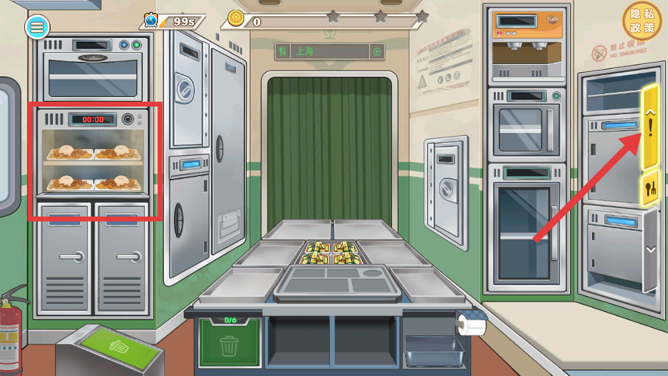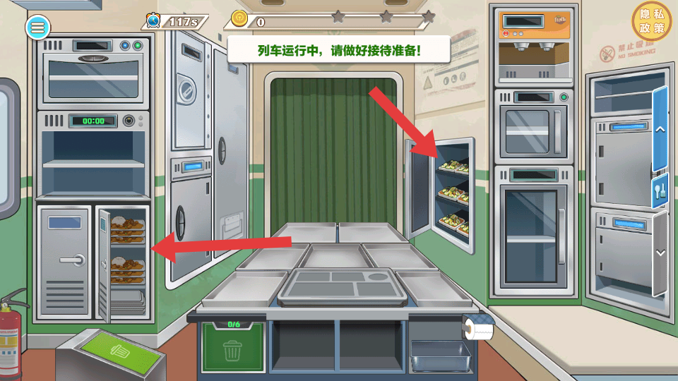 2、进入厨房场景,看到列车运行提示后,点击箭头所指的橱柜,提前准备好餐食食材。